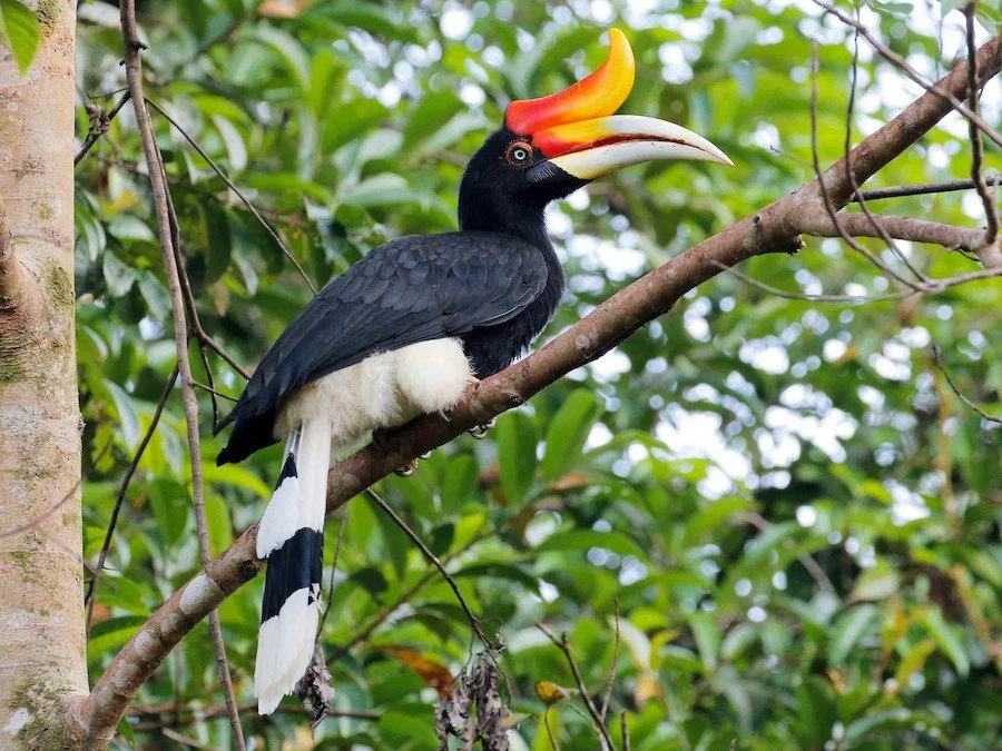 Hornbills are among the most impressive birds of the rainforest. The rhinoceros hornbill is easily recognized by its large curved bill and distinctive casque on top of its beak.